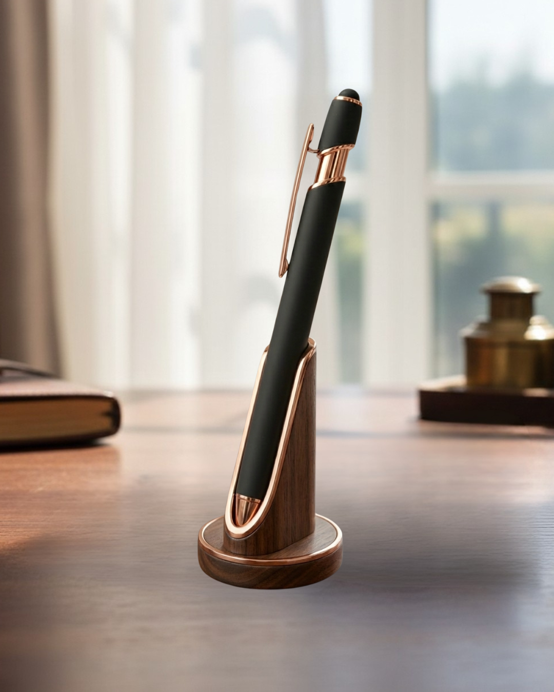 A premium matte black pen with rose gold accents, crafted for smooth writing and stylus. Its sleek design and luxurious finish make it ideal for corporate gifting, branding, or everyday professional use.