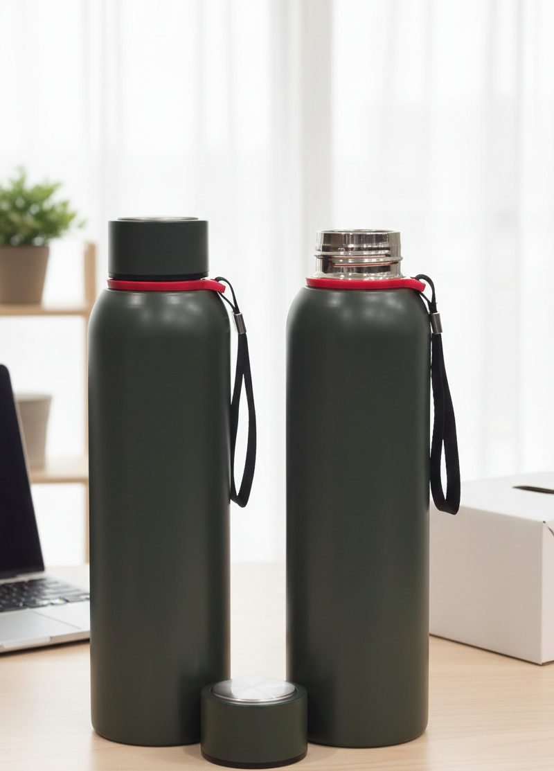 A 800 ml rugged insulated bottle with red accents a stainless steel mouthpiece. Designed for durability and portability, it features a secure carry strap and keeps beverages hot or cold for hour perfect for travel, office, or outdoor use