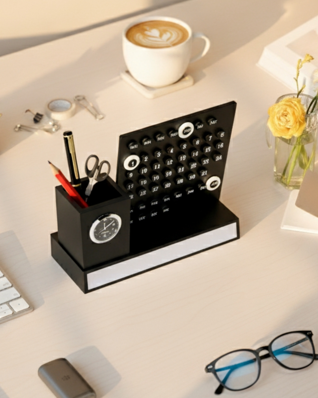 A multifunctional organiser featuring a pen holder, analog clock, and a perpetual calendar. Designed for modern workspaces, it keeps your essentials neatly arranged while adding a touch of elegance to your desk.