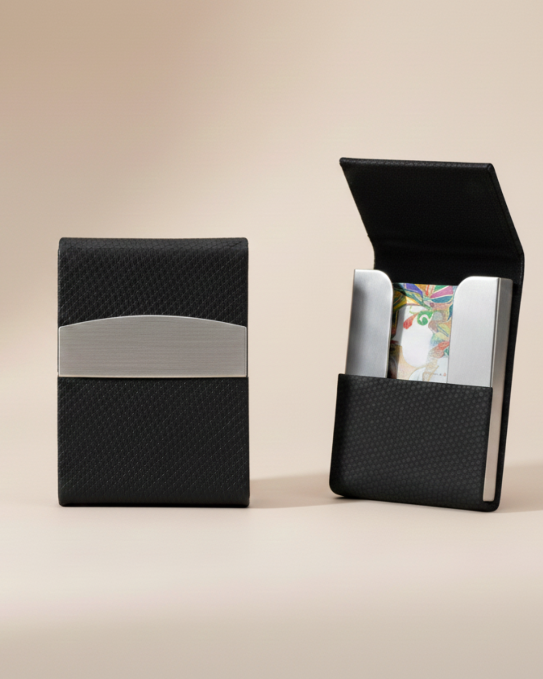 A premium black cardholder with a textured leather finish and sleek metallic accent. Designed for professionals who appreciate timeless style and secure organization, it’s perfect for storing business cards, IDs, or currency