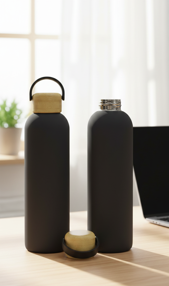 A sleek 750ml matte black reusable bottle with a natural wooden cap and carry loop. Designed for style and sustainability, it’s perfect for daily hydration at work, home, or on the go.