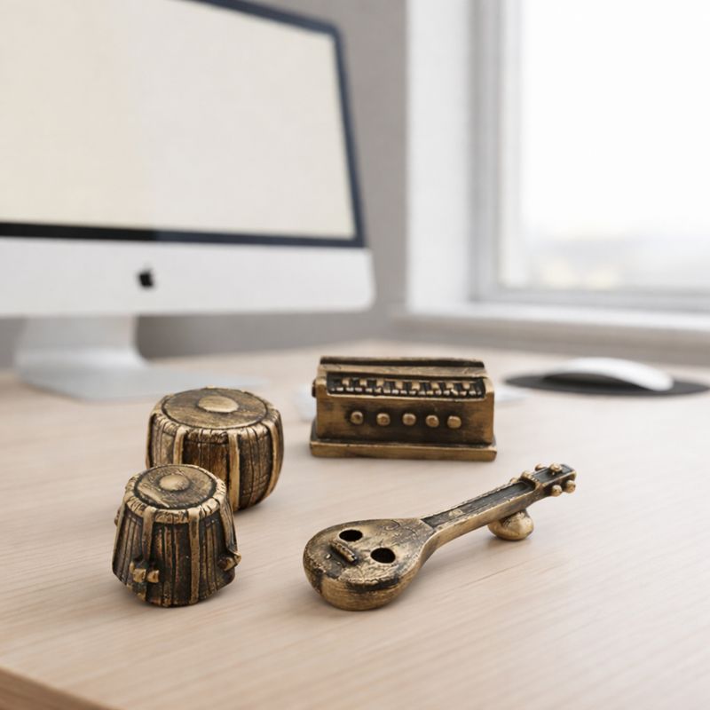 A miniature bronze-finish tabla set crafted as a decorative paperweight. Blending traditional Indian artistry with modern utility, it adds a touch of culture and charm to any desk or workspace