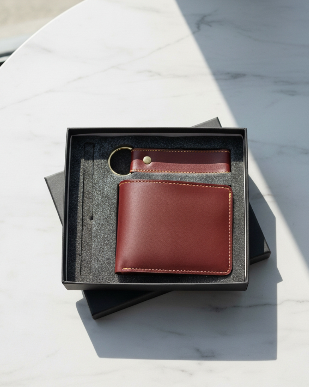 A compact and elegant faux leather gift set featuring a smooth-finish wallet with keychain Packed in a premium black box with foam insert, it’s ideal for corporate gifting, festive occasions, and stylish everyday use.