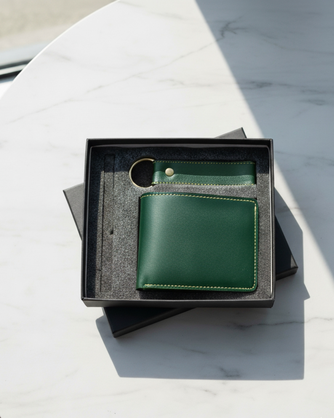 A compact and elegant faux leather gift set featuring a smooth-finish wallet with keychain Packed in a premium black box with foam insert, it’s ideal for corporate gifting, festive occasions, and stylish everyday use.