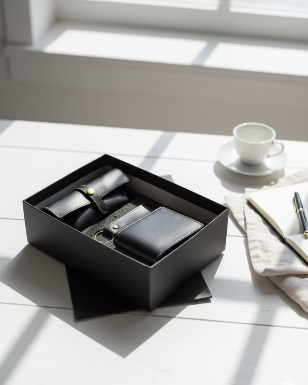 A sophisticated faux leather gift set featuring a wallet, keychain, and goggle cover, all elegantly arranged in a premium black box. Ideal for corporate gifting, festive occasions, or personal milestones, this set blends utility with timeless style.