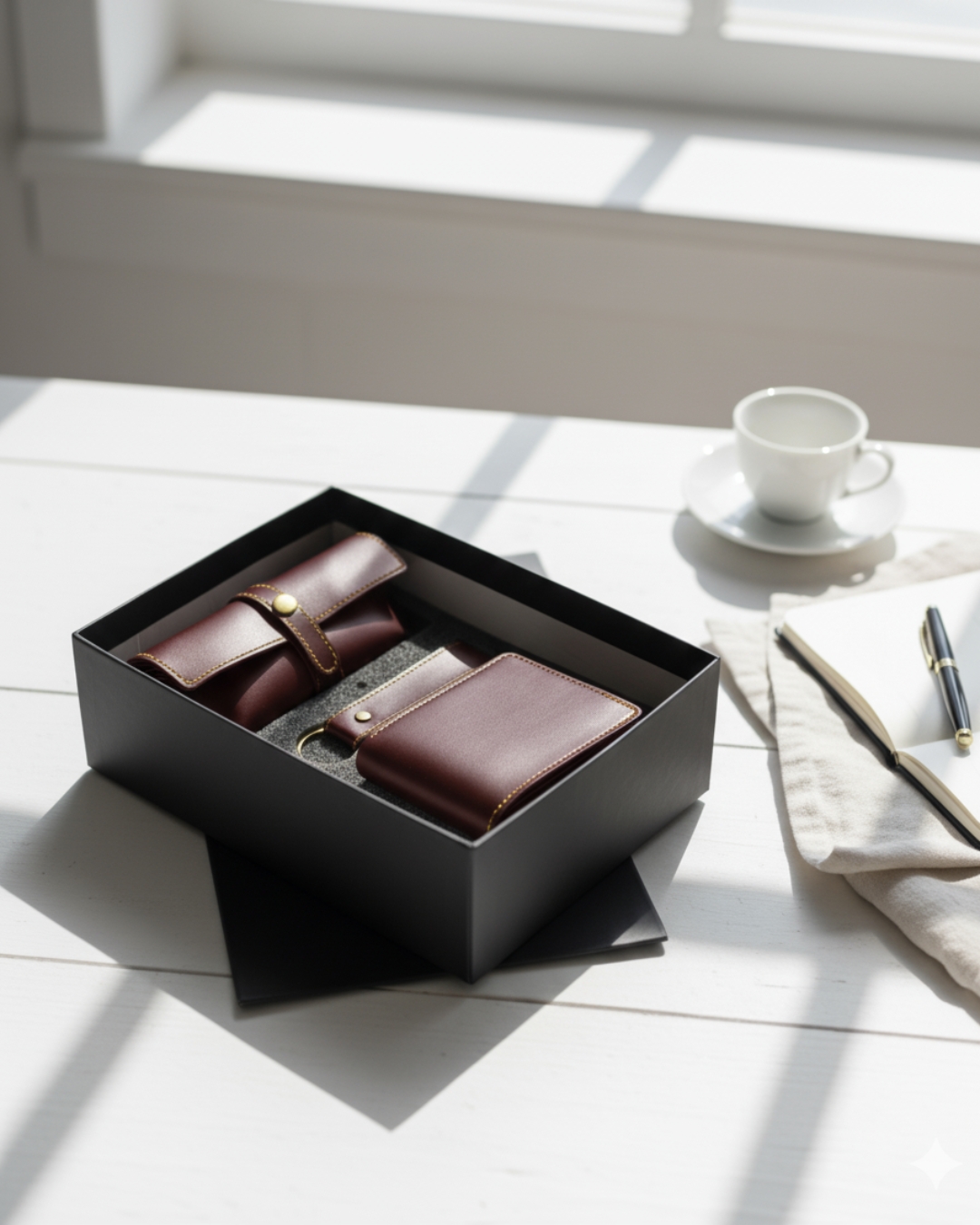 A sophisticated faux leather gift set featuring a wallet, keychain, and goggle cover, all elegantly arranged in a premium black box. Ideal for corporate gifting, festive occasions, or personal milestones, this set blends utility with timeless style