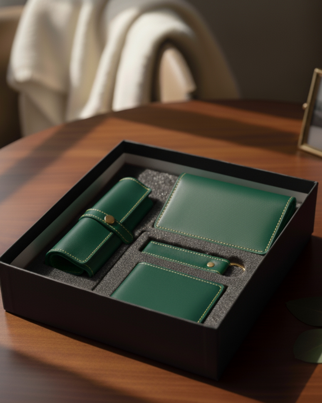 A premium faux leather gift set featuring a curated selection of everyday essentials, including a wallet, keychain, Goggle Cover, and passport cover. Elegantly packed in a black presentation box, it’s ideal for corporate gifting, festive occasions, or personal milestones.