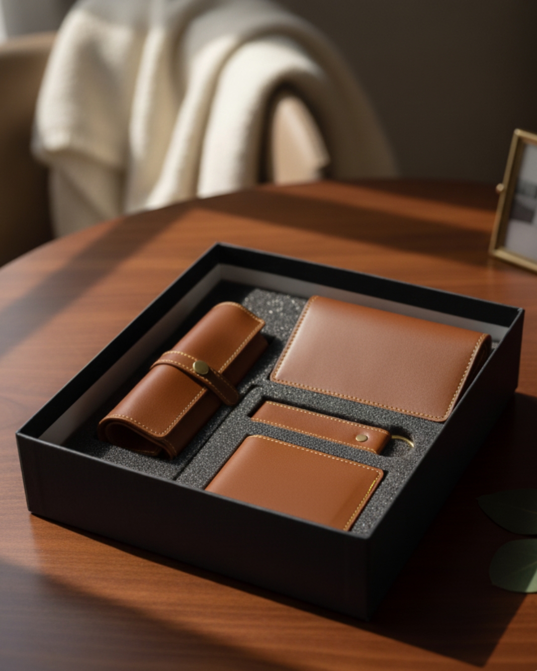 A premium faux leather gift set featuring a curated selection of everyday essentials, including a wallet, keychain, Goggle Cover, and passport cover. Elegantly packed in a black presentation box, it’s ideal for corporate gifting, festive occasions, or personal milestones.
