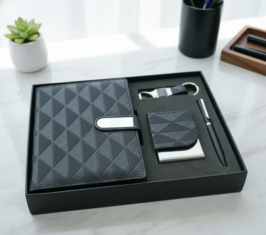 A premium Black toned gift set featuring a diamond-textured notebook, matching cardholder, elegant pen, and a sleek keychain. Perfect for corporate gifting, this set blends utility with sophistication for a lasting impression.