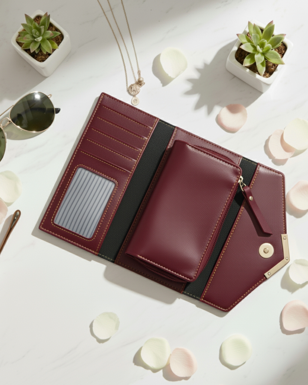 A stylish faux leather wallet designed for modern utility. Featuring multiple card slots, a transparent ID window, and a secure zip pouch, it’s perfect for organizing essentials with elegance and ease.