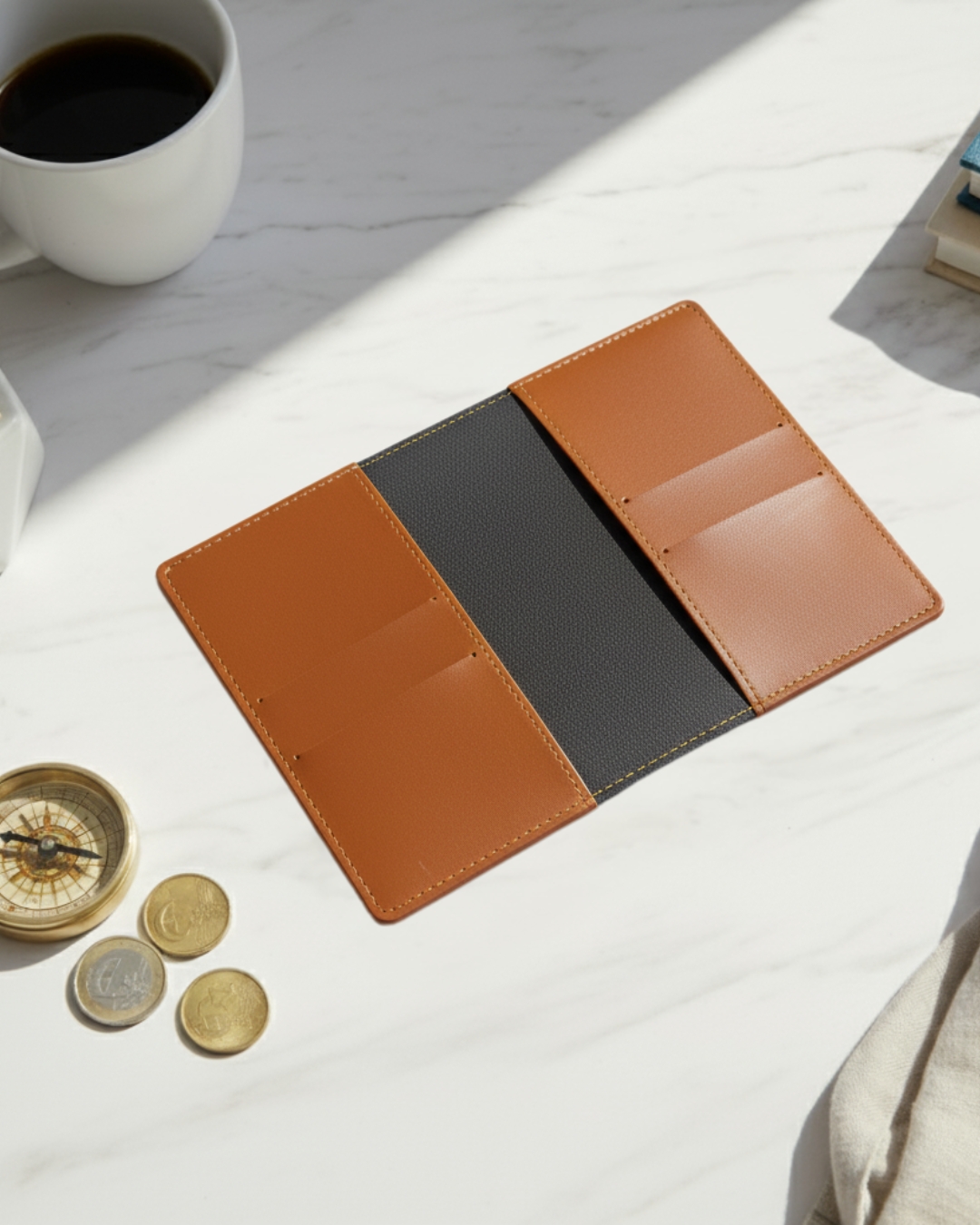 Crafted from premium faux leather, this elegant tan passport cover offers both protection and style. With multiple card slots and a sleek tri-fold design, it’s perfect for organized, hassle-free travel.