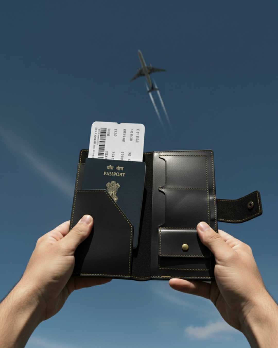 A premium faux leather wallet designed to keep your passport, boarding pass, and travel essentials secure and stylish. Its rich black finish and sleek layout make it the perfect companion for frequent flyers and travel enthusiasts.