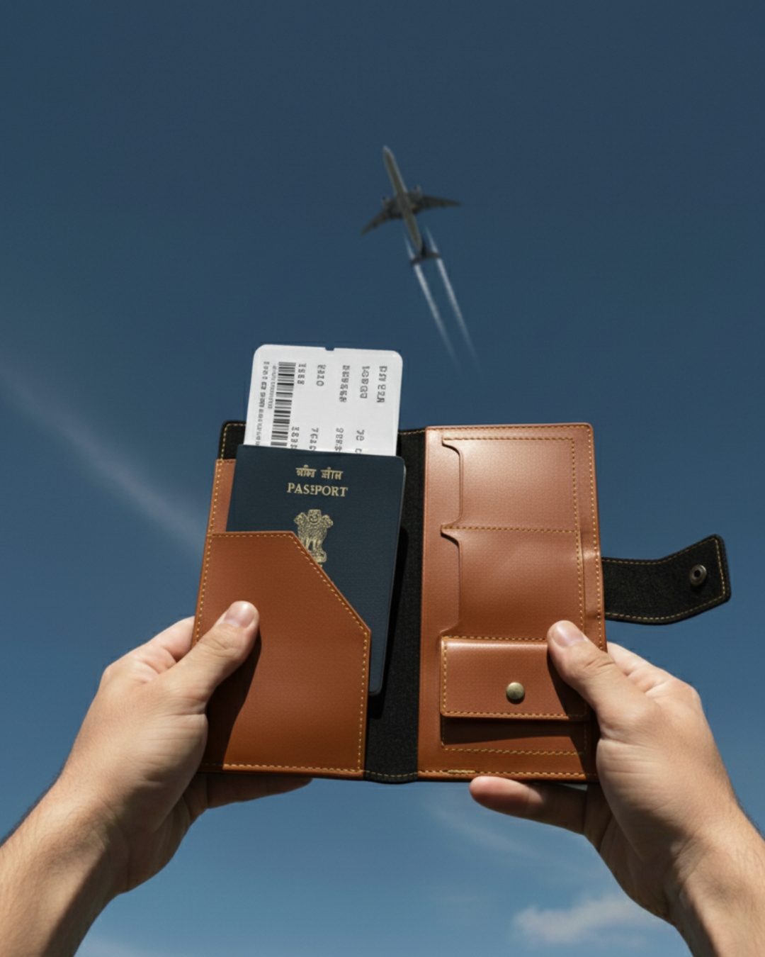 A premium faux leather wallet designed to keep your passport, boarding pass, and travel essentials secure and stylish. Its rich brown finish and sleek layout make it the perfect companion for frequent flyers and travel enthusiasts